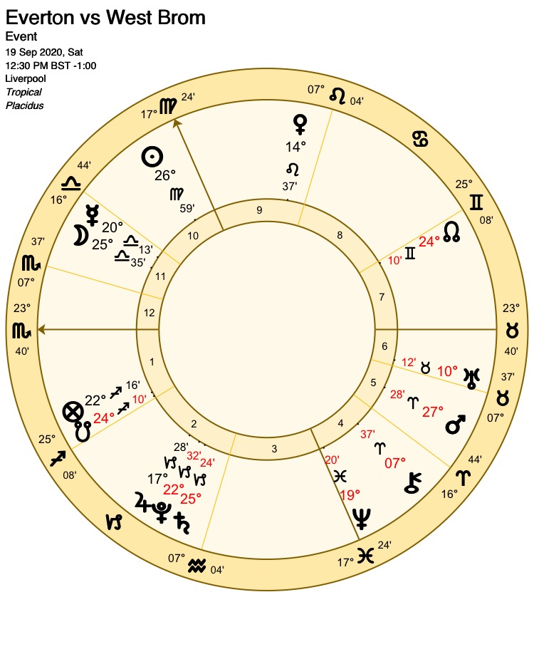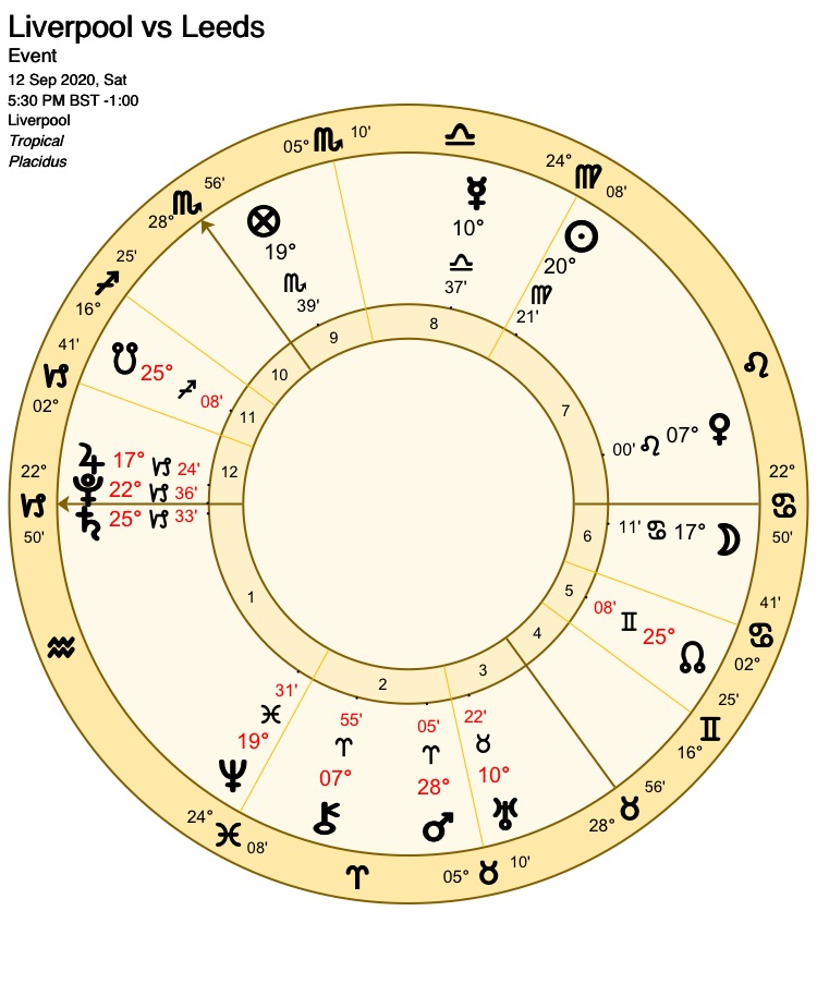 In Sunday afternoon’s match between Manchester City and Leicester City, the Moon’s opposition to Venus (Lady of the 4th house; victory to the underdogs) promises at least one goal for The Foxes. However, the following lunar sextile to retrograde Mars (Lord 10; victory for the favourites) is a powerful testimony for Manchester, especially combined with the added strength of Mars’ retrograde square to Saturn (Lord of the Ascendant and primary significator of the favourites), which describes victory (Mars, Lord 10) going to the Manchester City (Saturn, Lord of the Ascendant). As with the previous match between Spurs and Newcastle, expect both teams to score, with a busier second half and some crucial late goals!
