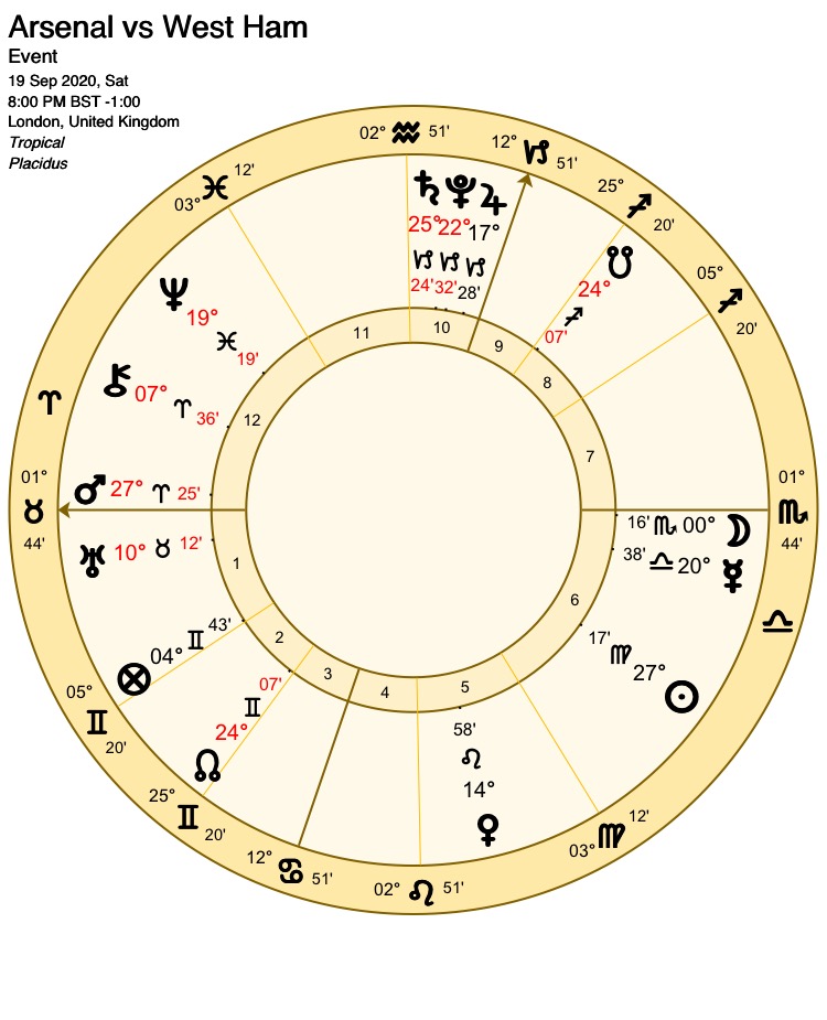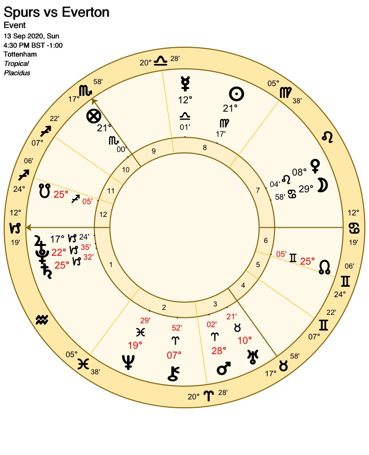 Spurs are odds-on favourites to win against visitors Newcastle this Sunday, but do the heavens agree? The Moon, who so often decides these contests, makes no aspects of significance with the exception of a late opposition to Venus. This might be seen as favourable for Spurs, were it not that Venus’ role as dispositor of the Part of Fortune takes precedence over her rulership of the 10th house (victory for the favourites). This opposition is immediately followed by a sextile to retrograde Mars, strongly placed in his own sign of Aries. As Mars rules the 4th house (victory for the underdogs) the cause of Newcastle is favoured, especially as Mars is also applying to conjunct the 4th house cusp, lending his strength to Newcastle’s house of victory. Overall, this chart is far from conclusive, but there should be goals for both sides. With the comparatively wide orb between the Moon and any significant aspects, expect a much busier second half, with Newcastle’s chances of victory increasing greatly in the latter minutes of the game, especially if extra time is played.
