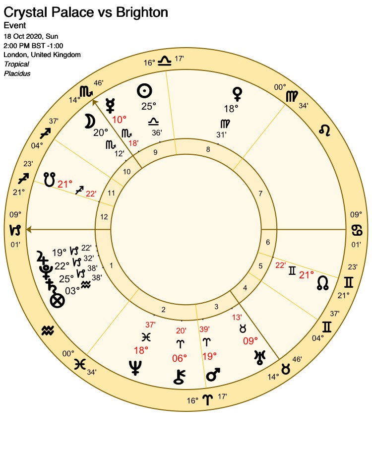 *Note: The Part of Fortune herself is placed just inside the 7th house (the team considered to be the underdogs), which might be thought helpful for West Ham. However, the bodily placement of Fortuna is linked to the Moon’s phases and will always be roughly in the same place in charts calculated for the same kickoff time and location during the month. Identical results might be expected for every match played under similar conditions of place and time, and experience has taught this is not the case. The position of Fortuna’s antiscion, which is determined by sign placement, is much more variable and therefore the testimony of significance.