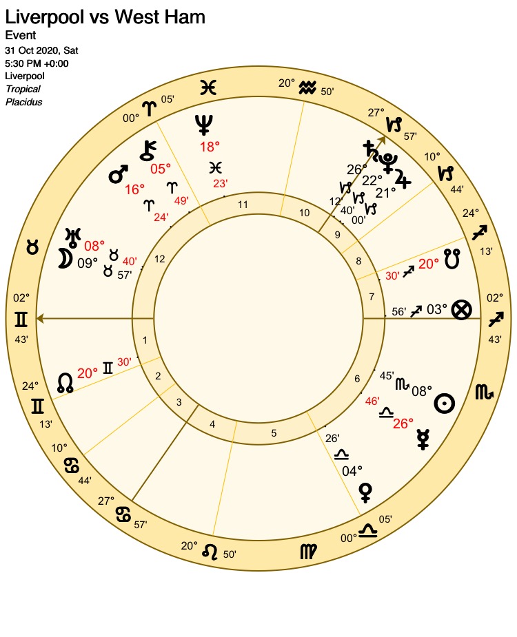 Liverpool are odds-on favourites to win against West Ham this Saturday, an opinion with which the heavens concur: The antiscion of the Part of Fortune (at 26 Capricorn 48) exactly conjunct Saturn (Lord 10, victory for the favourites) should prove the bookies correct.