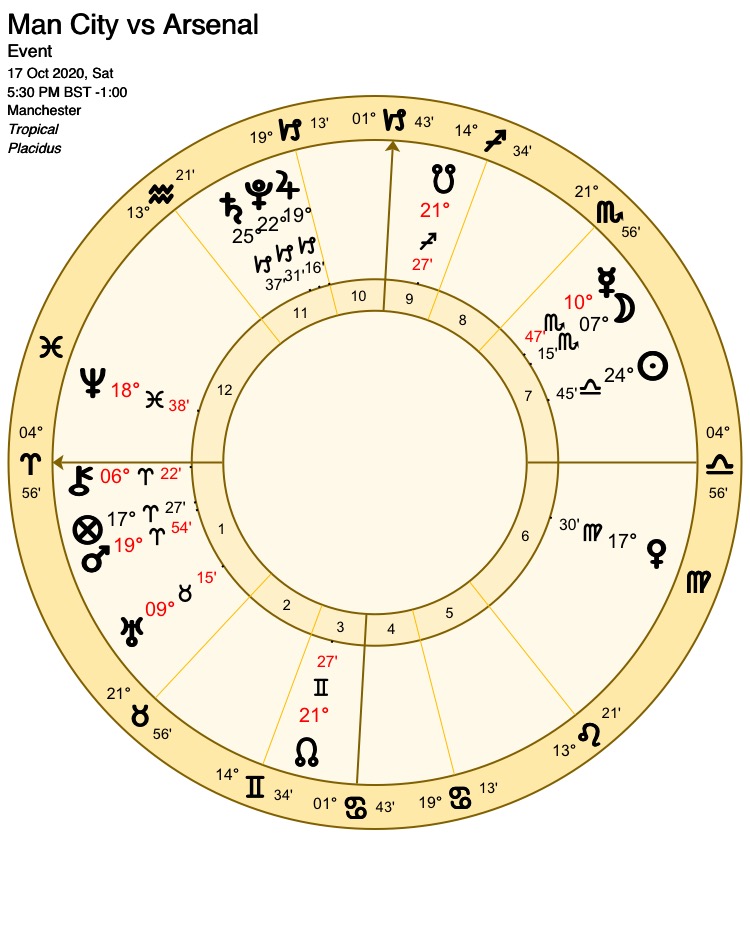 *Note: The Part of Fortune herself is placed just inside the 7th house (the team considered to be the underdogs), which might be thought helpful for West Ham. However, the bodily placement of Fortuna is linked to the Moon’s phases and will always be roughly in the same place in charts calculated for the same kickoff time and location during the month. Identical results might be expected for every match played under similar conditions of place and time, and experience has taught this is not the case. The position of Fortuna’s antiscion, which is determined by sign placement, is much more variable and therefore the testimony of significance.