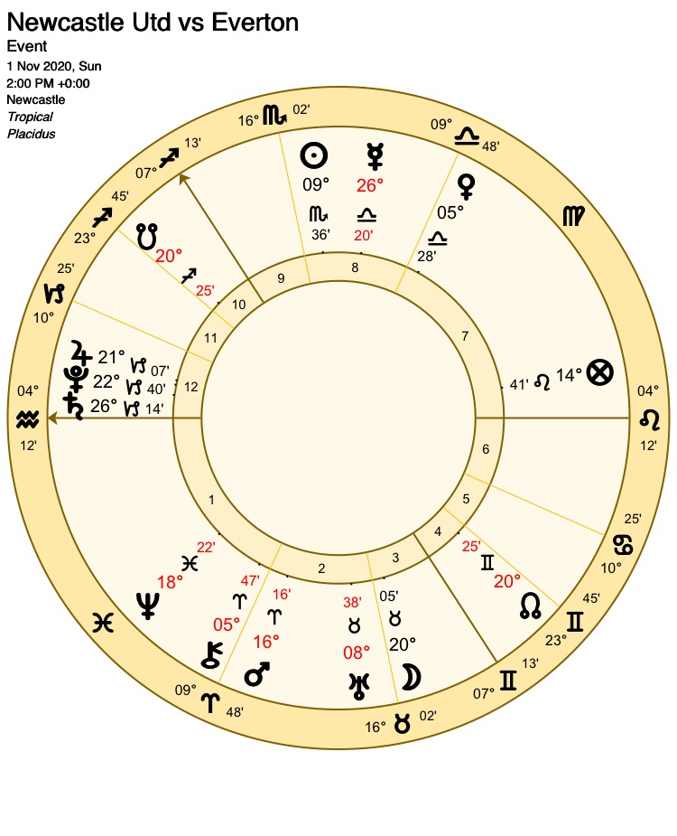 Saturn again has a starring role in Sunday’s match between Newcastle and Everton, this time in his role as Lord of the Ascendant awarding victory to favourites Everton via his trine with the Moon. The result of the match should be decided in the closing minutes of the match or extra time (the Moon has just over 6 degrees to travel to complete the aspect with Saturn). Should this late opportunity not occur, a draw is not beyond the bounds of possibility: The Moon also makes aspects to the antiscion of the Sun, Lord 7 (at 20 Aquarius 24) for Newcastle and Jupiter (Lord 10, for Everton at 21 Capricorn 07) before her aspect to Saturn, promising goals for both sides.