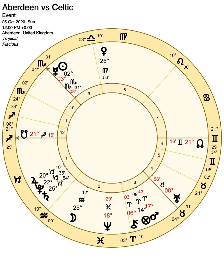 On to Sunday, where Aberdeen play hosts to favourites Celtic at Pittodrie. Although hindered by the baleful influence of the South Node conjunct the cusp of the 1st house, Celtic should emerge the victors, assisted by the applying conjunction of Fortuna with her dispositor, retrograde Mars.
