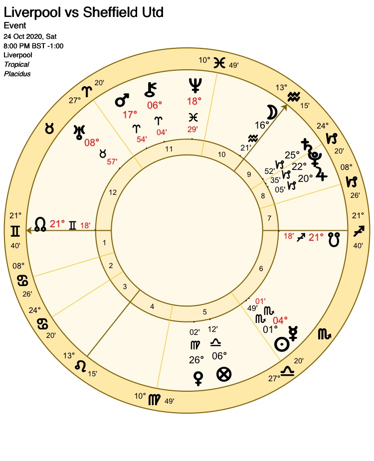 The North and South nodes once again make their influence felt in Saturday’s early evening match between favourites Liverpool and opponents Sheffield Utd. The North Node placed exactly on the cusp of the Ascendant should give a boost to the fortunes of the hosts, whilst the South Node may be expected to cause corresponding problems for Sheffield. The Moon just inside the 10th house (victory for the favourites) is a further powerful testimony for Liverpool. The primary significator of Liverpool, Mercury (Lord 1) would appear at first to be hindered by combustion (close proximity to the Sun), but as the Sun is also ruler of a house representing one of the teams (the 4th house; victory for Sheffield), this debility has less significance. On balance, a likely win for favourites Liverpool.