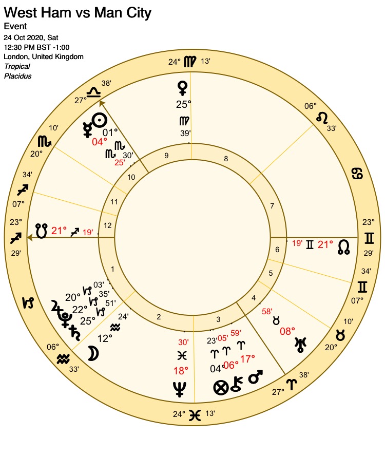 This Saturday Manchester City travel to London Stadium to play West Ham and, if the bookies are correct, are expected to win comfortably. But do the heavens agree? The debilitating South Node afflicting the cusp of the 1st house (which represents the favourites) could pose problems for City, just as the North Node on the cusp of the 7th house gives a corresponding boost to the fortunes of the opposing Hammers. Although powerful, this is the only testimony in West Ham’s favour. The rest of the chart inclines towards a victory for City, most notably the Moon’s sextile to Mars, the dispositor of the Part of Fortune: Harmonious aspects from the Moon to the Fortuna or her dispositor traditionally favour the favourites (it may also be noted that Mars rules the 4th house, representing victory for the underdogs, but unfortunately for West Ham his role as the dispositor of Fortuna takes precedence). West Ham are represented by the 7th house ruler Mercury who is currently retrograde and moving ever closer to the Sun. Whist retrograde motion is not usually a debility in contest charts of this type, combustion very much is; the likelihood being that, on this occasion, West Ham will find the challenge of City too hot to handle.