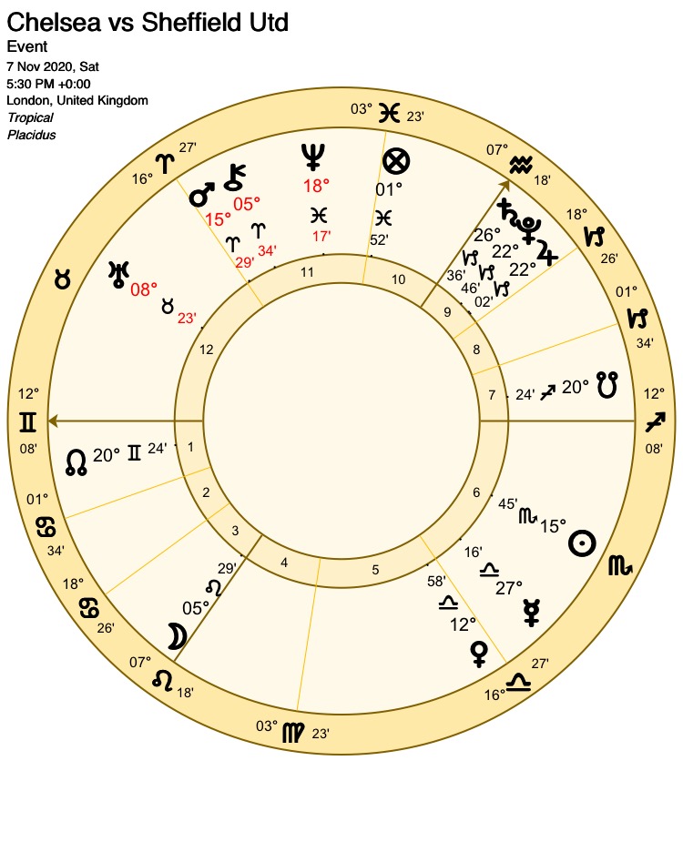According to the pundits, Saturday’s Premiership clash between Chelsea and Sheffield United is a foregone conclusion, with Chelsea set for easy victory: But do the heavens agree? The Moon applies to conjunct the 4th house (victory for the underdogs) and trines the antiscion of Jupiter, Lord 7 (at 07 Sagittarius 58), both testimonies for Sheffield which suggest that Chelsea will find this match more challenging than first supposed. However, Chelsea have an ace up their sleeve in the form of the Part of Fortune’s conjunction with the antiscion of Mercury (02 Pisces 44): This testimony is the strongest in the chart, and confirms that Chelsea are unlikely to lose. Nevertheless, there will be goals for both sides and if Sheffield play as well as expected, a draw may be possible.
