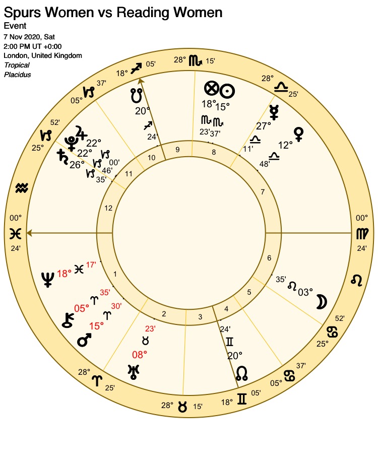 On to Saturday, and a Women’s Super League fixture between Spurs and Reading. Based on current form, Reading are favourites to win and are represented by Jupiter (Lord of the Ascendant). Their opponents Spurs are signified by the 7th house and its ruler Mercury. The Moon applies first to trine the antiscion of Jupiter (at 07 Sagittarius 59), pointing to a goal (or potential early lead) for Reading. The next testimony from the Moon, an opposition to the antiscion of the Part of Fortune (at 11 Aquarius 37) offers hope of an equalizer to Spurs. But since the Moon has to travel over 7 degrees to perfect this aspect and an orb of 5 degrees is usually the effective limit for a 90 minute football match, the best chance for Spurs will occur in the latter minutes, success becoming more likely the match strays into extra time.