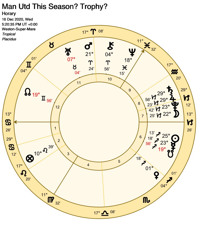 Because it is asked by a supporter of Manchester United, the question is essentially; “How will we do? Will we win a trophy?”: For this reason, Manchester United are described by the 1st house (representing the self) and its ruler. Had the question been asked by someone who did not support United, they would instead have been signified by the planet ruling the 7th house (which represents any team other than the one you support).