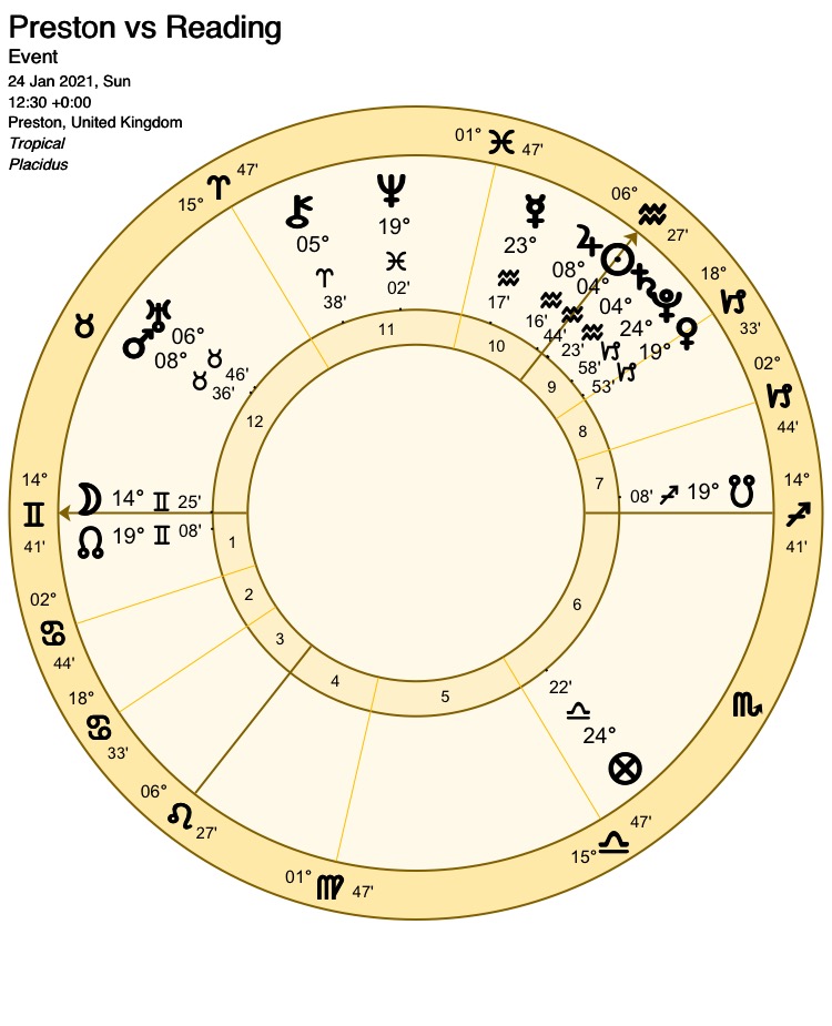 Placed higher in the table and enjoying an impressive run of wins, visitors Reading look the more likely favourites and are awarded the 1st house and its ruler Mercury at 23 Aquarius 17. Jupiter at 08 Aquarius 16, rules the opposing 7th house and describes hosts Preston.