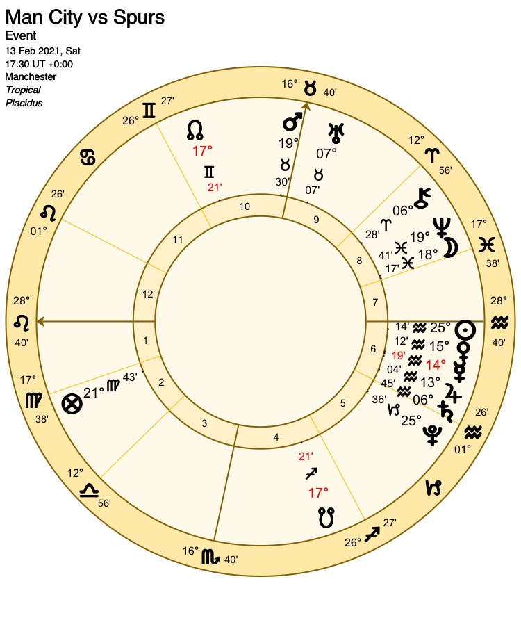 At first glance, the heavens appear to cast their vote in favour of City: The Sun who, as ruler of the 1st house represents the favourites is placed on the cusp of the 7th house, representing opponents Spurs. This depicts the fortunes of Spurs held hostage by City. Compounding the misery for Spurs, Mars (ruler of the 4th house; victory for the underdogs) is placed inside the cusp of the 10th house (victory for favourites City): This again shows Spurs in the power of their rivals.