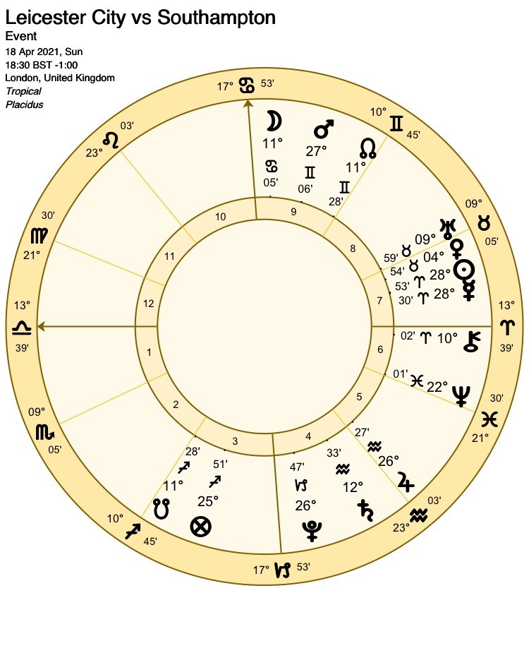 On to Sunday, when Leicester City and Southampton do battle to win a place in the final opposite the winners of Saturday’s semi-final. This chart is clearer to interpret, as we do not have to deal with a void of course Moon. The Moon, strong in her own sign of Cancer, applies to conjunct the cusp of the 10th house. This powerful testimony of victory for the favourites, is further underlined by the sextile between the Part of Fortune and its dispositor.