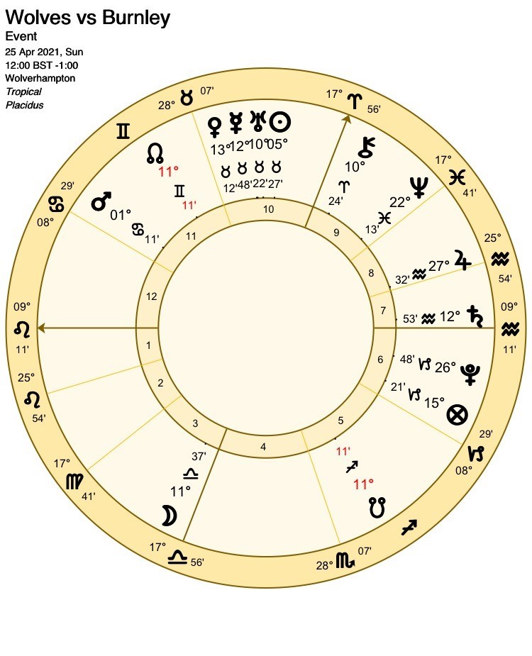 The Moon later aspects Venus (for Arsenal), but has over 8 degrees to travel before she perfects their conjunction. For a 90 minute football match, the effective orb for the Moon’s aspects is usually around 5 degrees. Any aspect made beyond that orb usually denotes an opportunity which occurs in extra time.