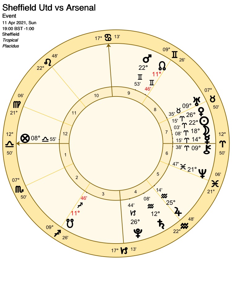 As the team most favoured to win, Arsenal are awarded the 1st house and its ruler Venus. At 26 Aries 15, Venus is in the sign of her detriment and is also combust (placed within 8 degrees of the Sun). In charts of this kind, debility by sign is not usually an obstacle to victory but combustion presents a more serious problem. In Arsenal’s favour, the Part of Fortune is placed near to the angle of the Ascendant, although at just under 4 degrees distant it is probably too far away to lend significant help.