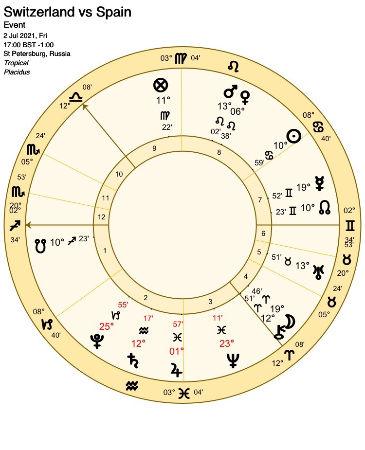 As odds-on favourites, Spain are awarded the 1st house and its ruler Jupiter. However, the only testimony of significance, an immediate sextile from the Moon to Mercury (Lord of the opposing 7th house) favours an early lead for Switzerland, an advantage they could consolidate into a surprise victory.