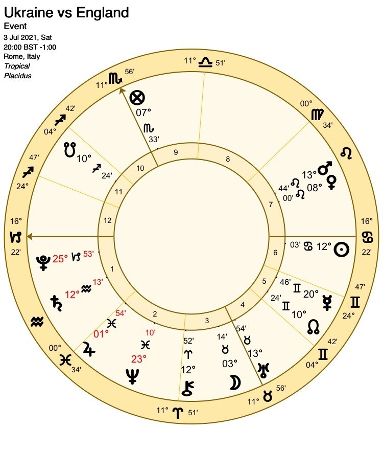 Those who watched Ukraine’s last game against Sweden will know they are not a team to underestimate, especially when they have the support of the Moon. She applies to square Venus, a doubly fortunate testimony for Ukraine as Venus is not only their main significator but also as Lord 4, represents victory for the underdogs.