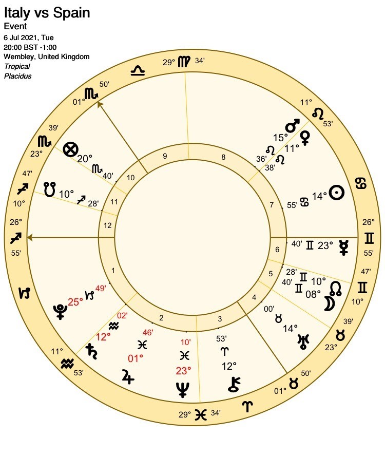 If Italy are truly the favourites, as their win record suggests, they are represented by 1st house ruler Saturn, strong in his own sign of Aquarius. Saturn is retrograde, which does not seem to be a hindrance in contest charts, especially here as it will hasten his opposition to the Moon, signifying at least one goal for Italy, (and potentially an early lead for the favourites).