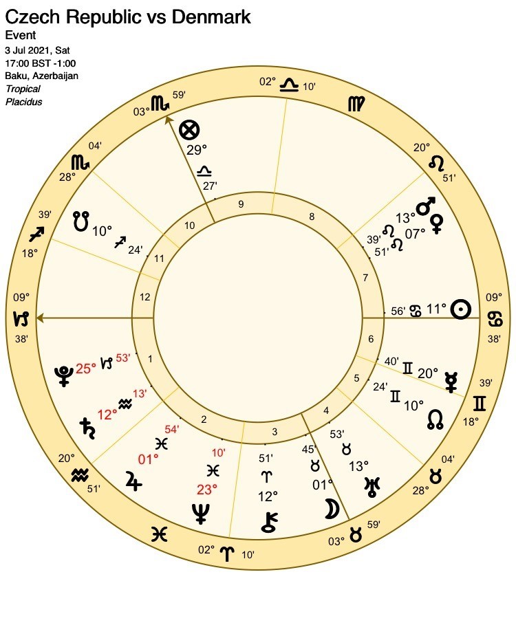 Making a balancing case for Denmark, there are two favourable testimonies from the Moon, a square to retrograde Saturn (Lord 1) and a square to Mars, (Lord 10, victory for the favourites). However, the Moon must travel a considerable distance (12-13 degrees) to perfect these aspects: This is much further than the 5-6 degrees of influence usually effective for a 90 minute football match: The best chances for Denmark will occur the longer the match continues into extra time, but they will still have to work hard to overcome a formidable challenge from the Czech Republic.