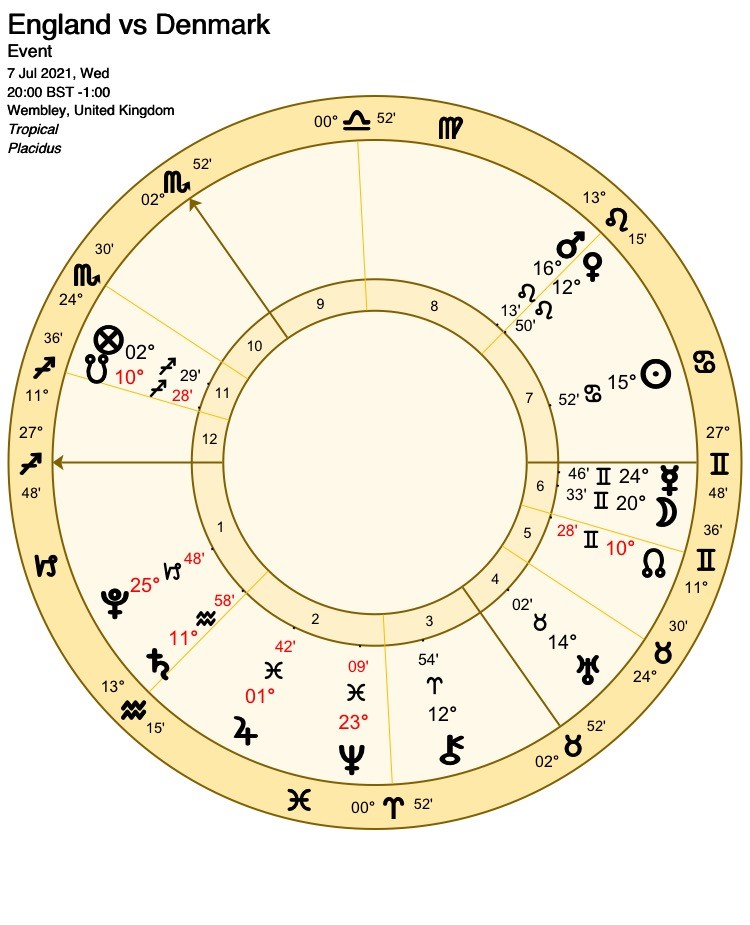 After their initial shaky start, they have gone from strength to strength. At current form, England would be unwise to underestimate them. They are described by Mercury, Lord of the opposing 7th house. Mercury is strongly placed in his own sign and lends that strength to Denmark’s cause by applying directly to the 7th house cusp.