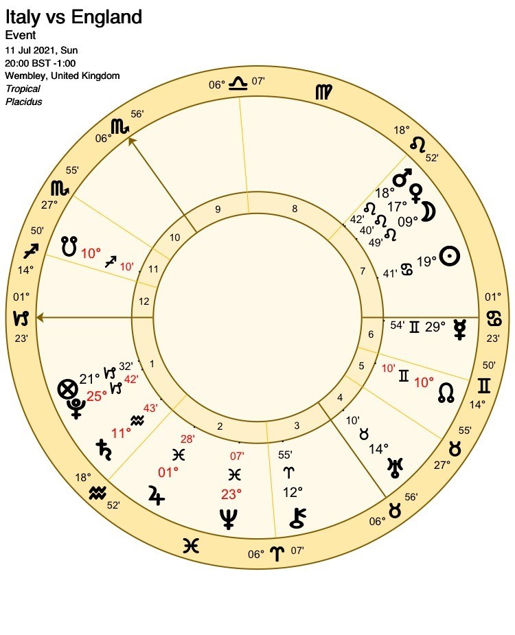 This is unfortunate for England supporters, as Jupiter although currently well-placed in his own sign of Pisces (traditional rulership), will shortly lose strength by moving retrograde into Aquarius. This can represent a loss of position or fall from grace, and although it did not seriously affect Italy’s performance in yesterday’s semi-final, it is a potentially negative testimony which cannot be ignored.