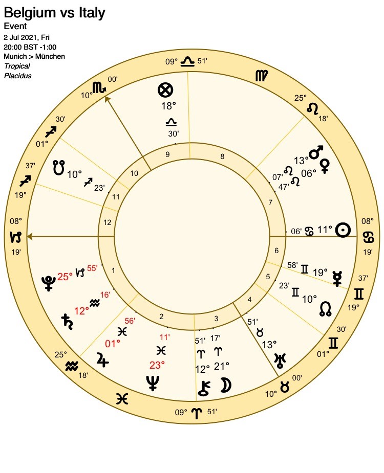 Far fewer surprises are likely in this evening’s clash between two tournament favourites, Belgium and Italy. With the exception of a square to retrograde Pluto (slightly detrimental to the favourites) the Moon makes no significant aspects within orb either in her current sign or the early degrees of the next. This is a likely sign that the status quo will be maintained: Despite the minor testimony of the lunar square to Pluto which may impact slightly on their performance, the team considered the strongest at the start of the game will be the likely winners at the finish. On the strength of this chart, favourites Italy can look forward to a place in the semi-finals.