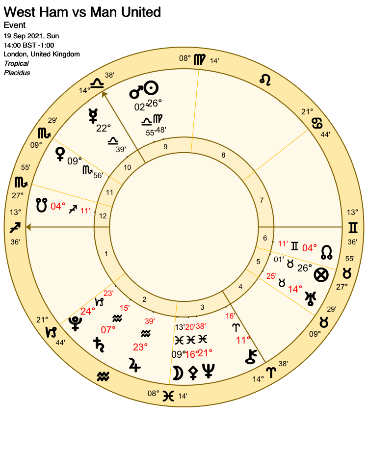 In his book “Sports Astrology”, John Frawley advocates using the 1st House and its ruler to describe the favourites and the opposing 7th house for the underdogs. Following this system, visitors Manchester United (currently top of the Table and hotly tipped for victory) are signified by Jupiter, ruler of Sagittarius, while Mercury as ruler of the 7th house, represents hosts West Ham.