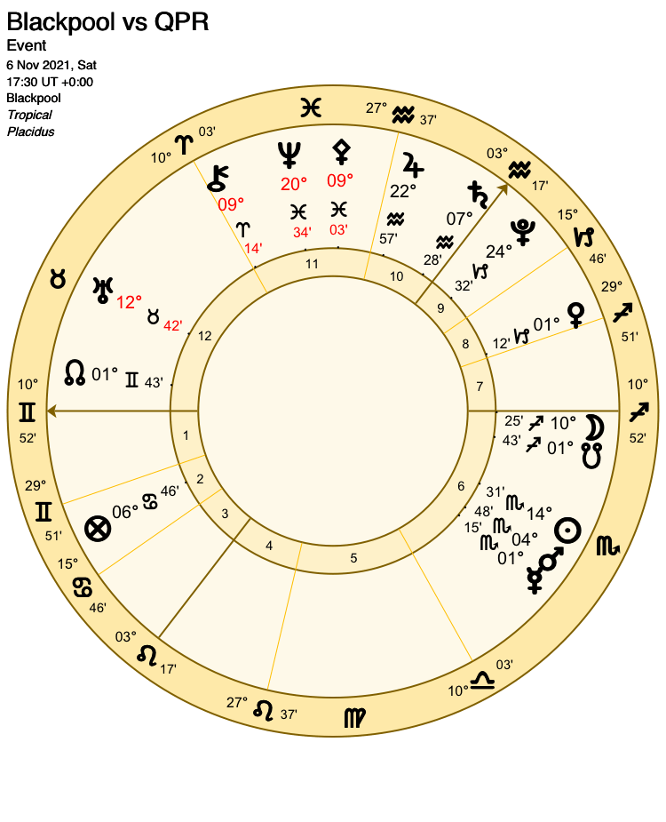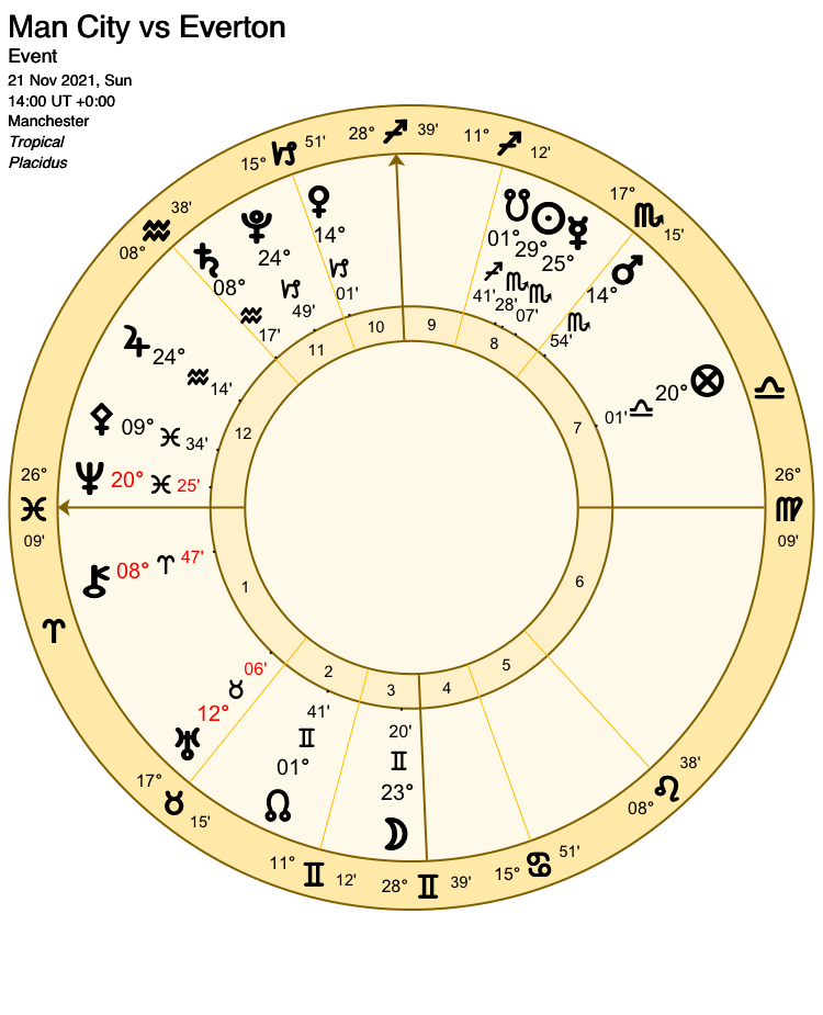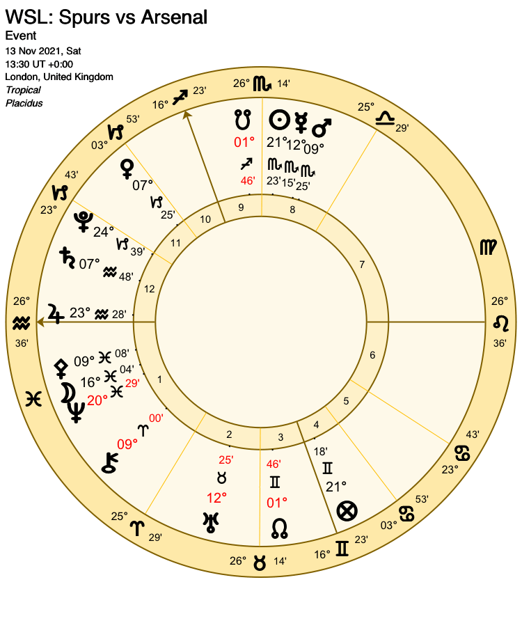 The astrological chart set for the kickoff seems to concur: Jupiter, Lord of the 10th house (victory and success) is placed just inside the cusp of the 1st house which represents Arsenal (because they are the favourites, not because they are the home team). Victory is within their grasp.