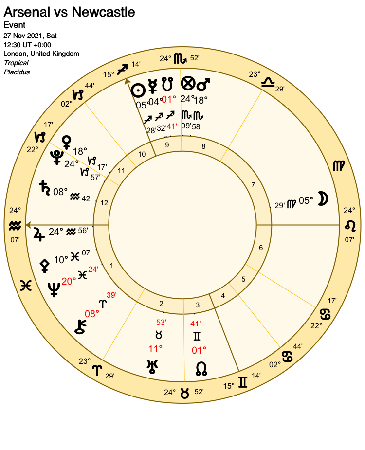 Placed 5th in the Premiership, 14 points separate Arsenal from Newcastle, languishing at the bottom of the table with just 6 points. Arsenal are clear favourites to win, but is this reflected in the heavens?