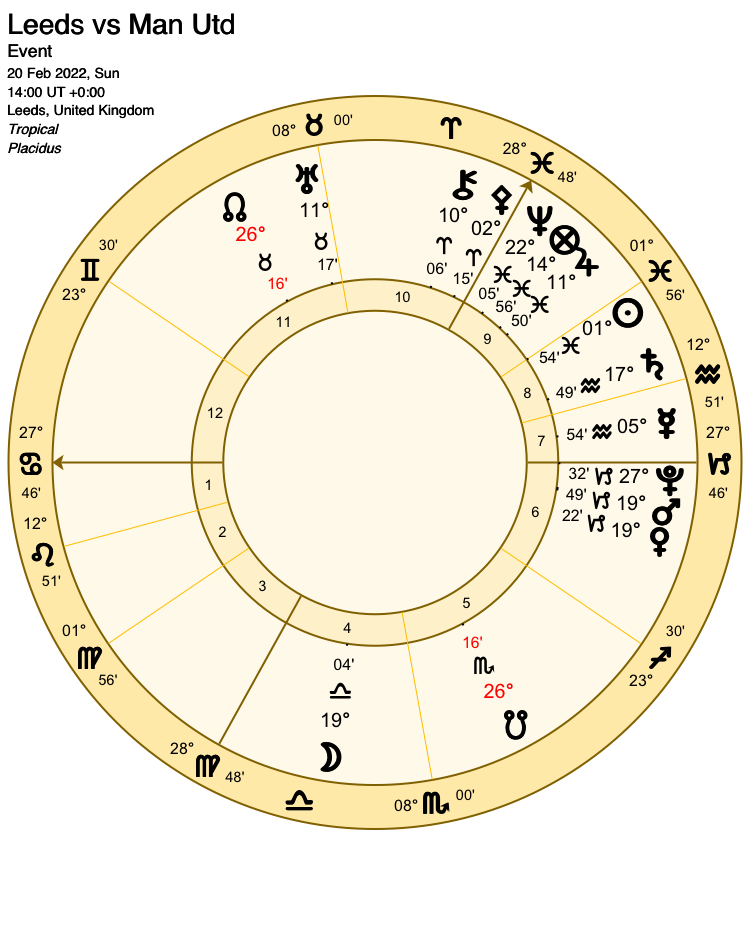 As favourites, Manchester United are signified by the 1st house. Cancer rises, and the 1st house ruler the Moon is otherwise occupied as significator of events, so the role of main significator for Manchester United is assumed by the Moon’s dispositor, Venus.