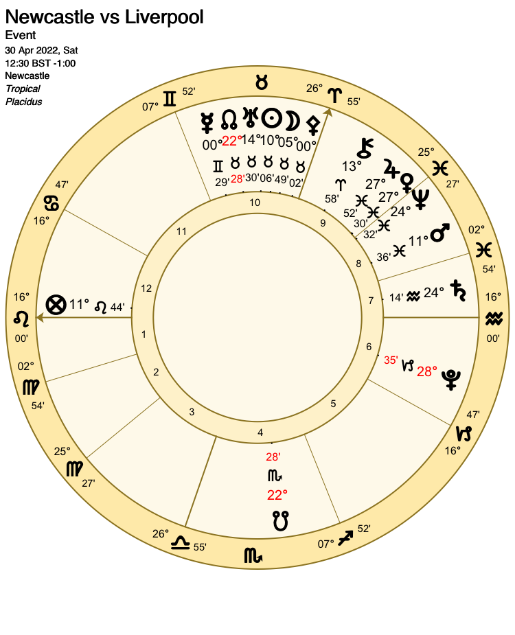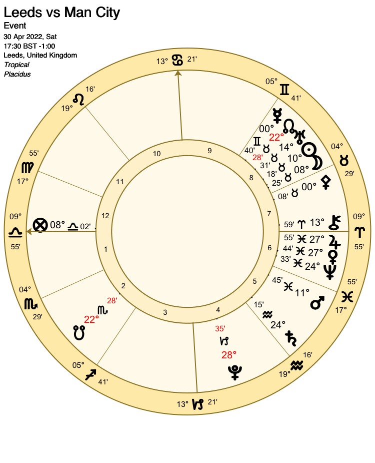 At first glance, the match for Leeds vs Man City, which takes place a few hours later, looks similar but has potential for a very different outcome. Here, the Moon still applies to conjunct the Sun but, as the Sun does not rule a house belonging to either team (1st and 10th for the favourites, 7th and 4th for the underdogs), this aspect lacks the importance it held in the previous Newcastle vs Liverpool match.