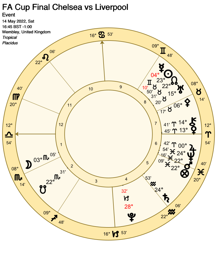 The close conjunction of the Part of Fortune with Mars, (7th house ruler and main significator of Chelsea) adds to Liverpool’s woes, as does the impending conjunction between the Moon and the antiscion of Saturn (Lord of the 4th house, victory for the underdogs) at 05 Scorpio 07.