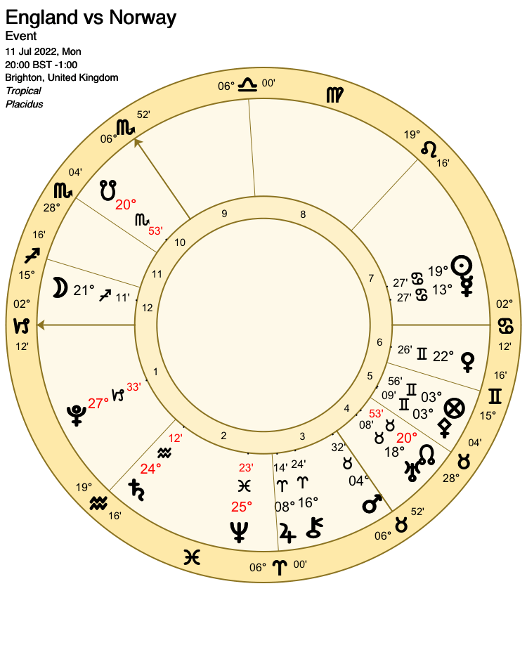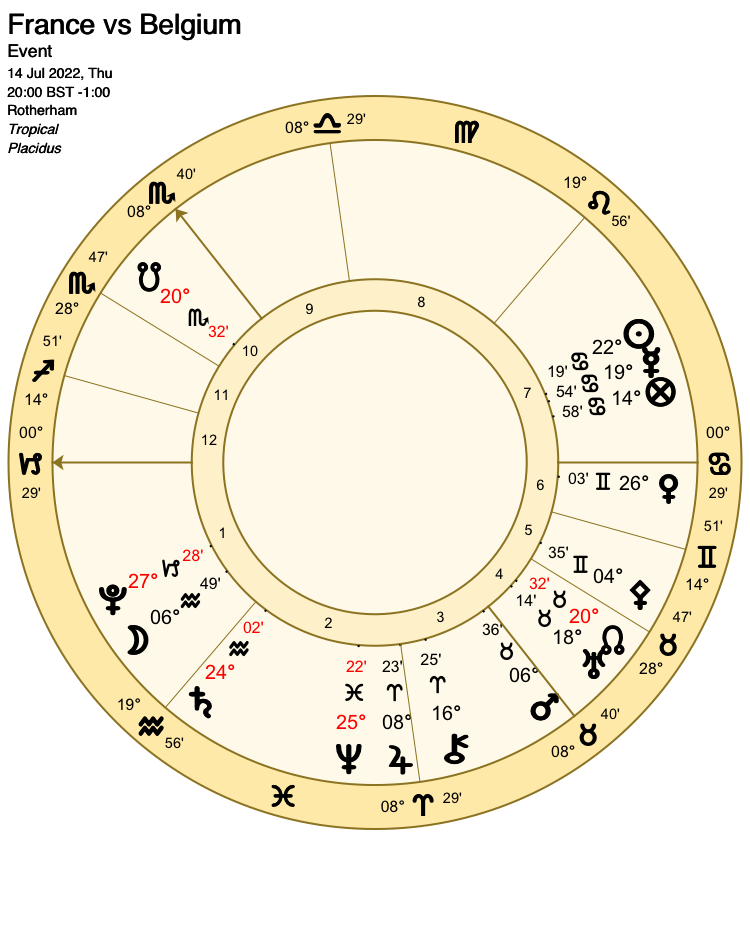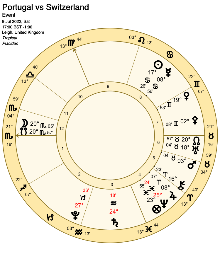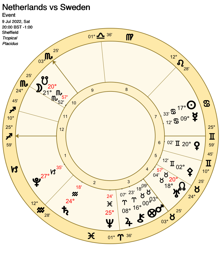 As in the Finland vs Germany match, the Moon still applies to sextile Mars; an important testimony for favourites Spain. But the antiscion of the Part of Fortune (at 11 Taurus 16) lies directly on the 4th house cusp; this is highly fortunate for Denmark.