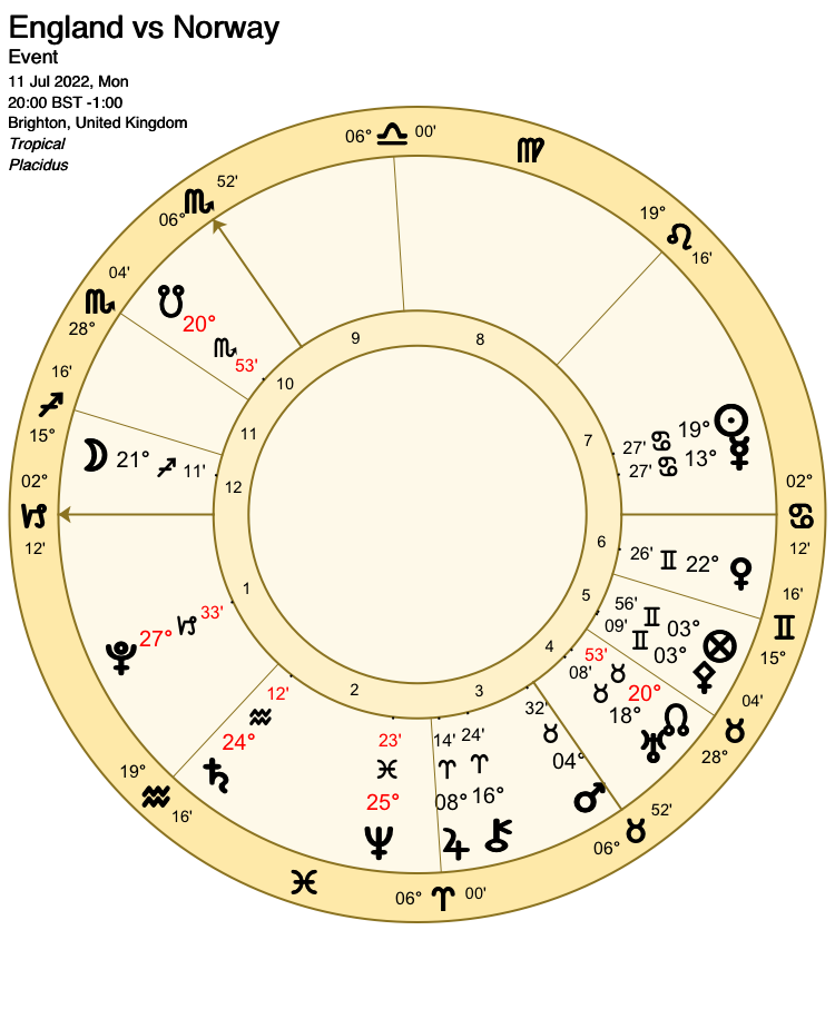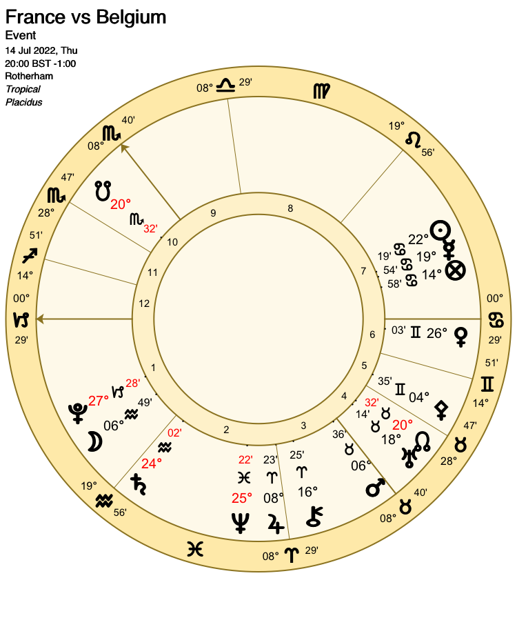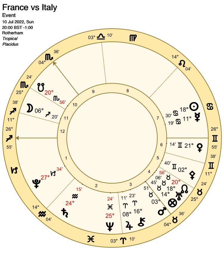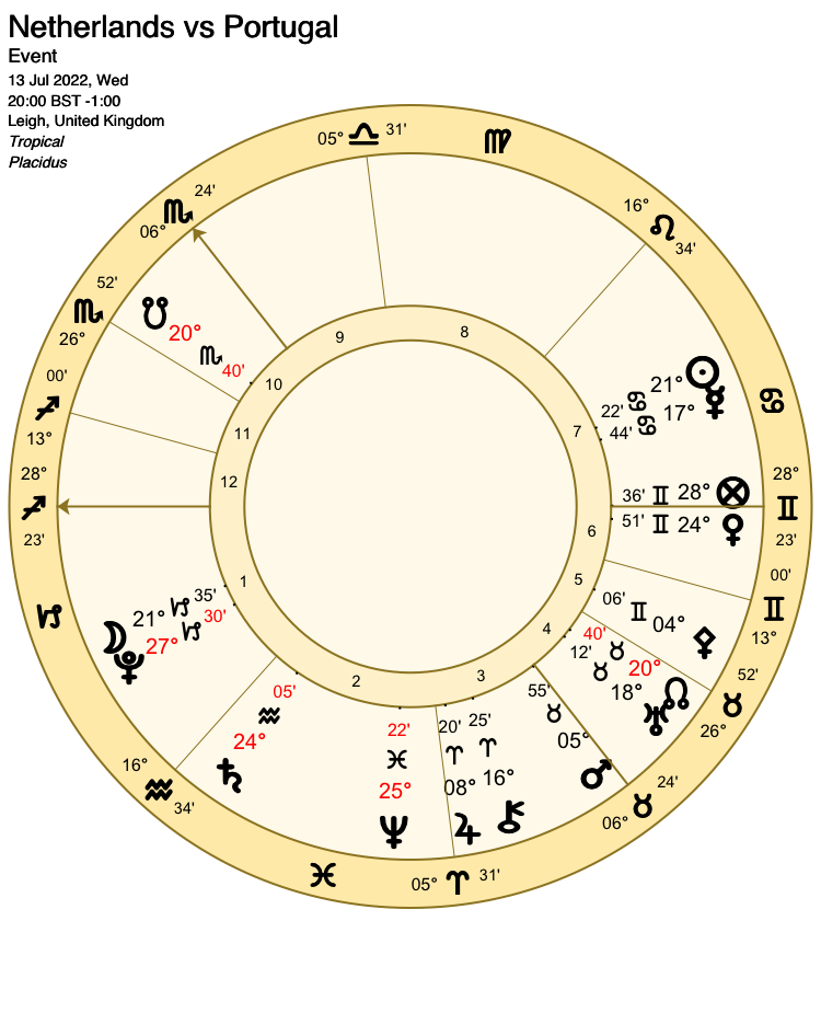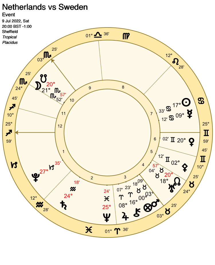 As in the Finland vs Germany match, the Moon still applies to sextile Mars; an important testimony for favourites Spain. But the antiscion of the Part of Fortune (at 11 Taurus 16) lies directly on the 4th house cusp; this is highly fortunate for Denmark.