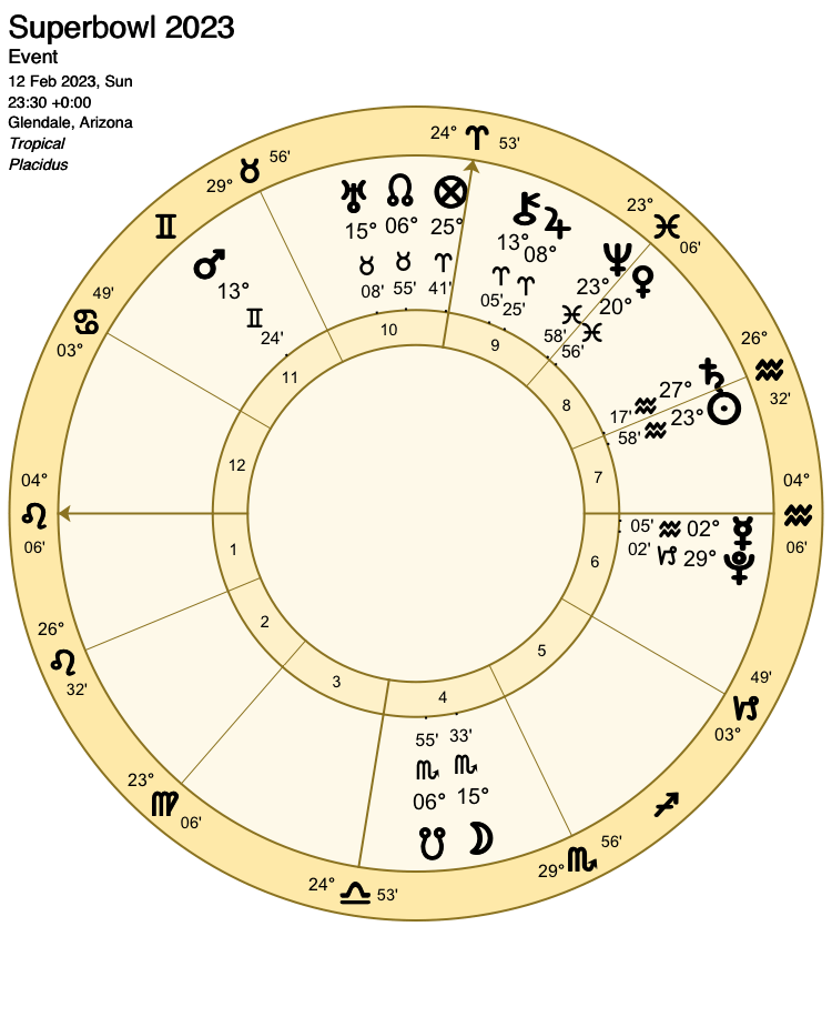 This leaves just one lunar aspect of note: A trine from the Moon to Venus, who as lord of the 4th house represents the Chiefs. A win for the Kansas City Chiefs seems the most likely outcome.