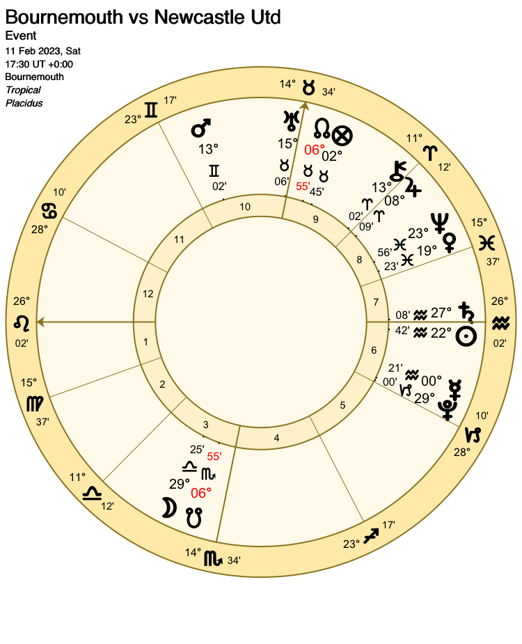 The Part of Fortune is placed just inside the 10th house cusp, but it is not its bodily placement which is important: As John Frawley in his book “Sports Astrology” notes, the Part of Fortune is linked to the phase of the Moon, so any game which begins around the New Moon would be won by the favourites, and the underdogs would win any game timed to start on a Full Moon. History shows this is not the case.