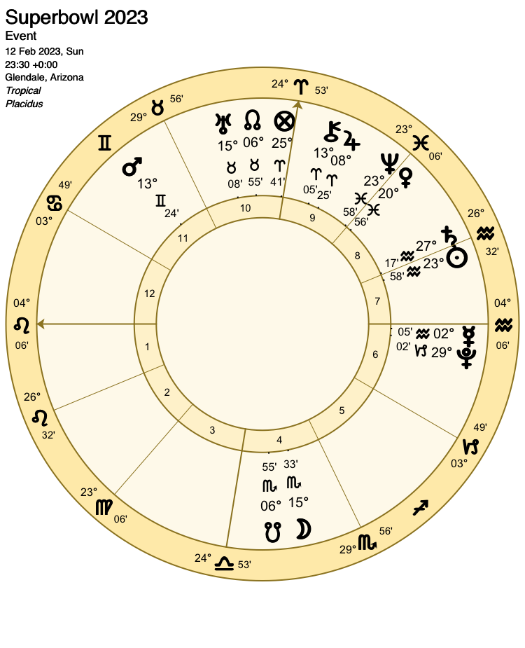 This leaves just one lunar aspect of note: A trine from the Moon to Venus, who as lord of the 4th house represents the Chiefs. A win for the Kansas City Chiefs seems the most likely outcome.