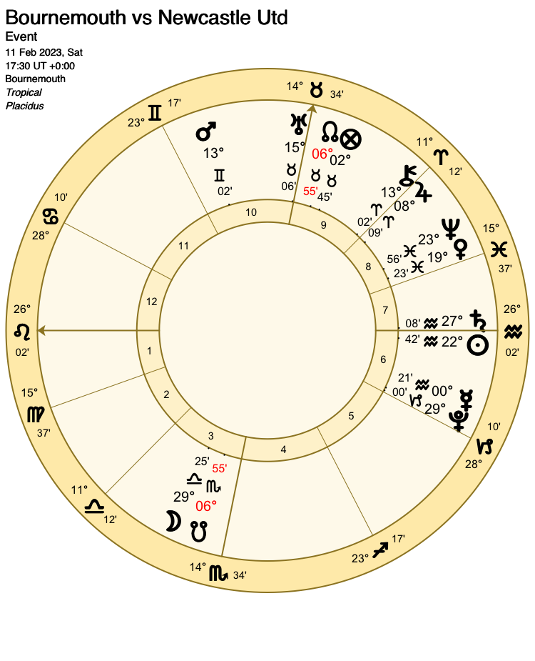 The Part of Fortune is placed just inside the 10th house cusp, but it is not its bodily placement which is important: As John Frawley in his book “Sports Astrology” notes, the Part of Fortune is linked to the phase of the Moon, so any game which begins around the New Moon would be won by the favourites, and the underdogs would win any game timed to start on a Full Moon. History shows this is not the case.