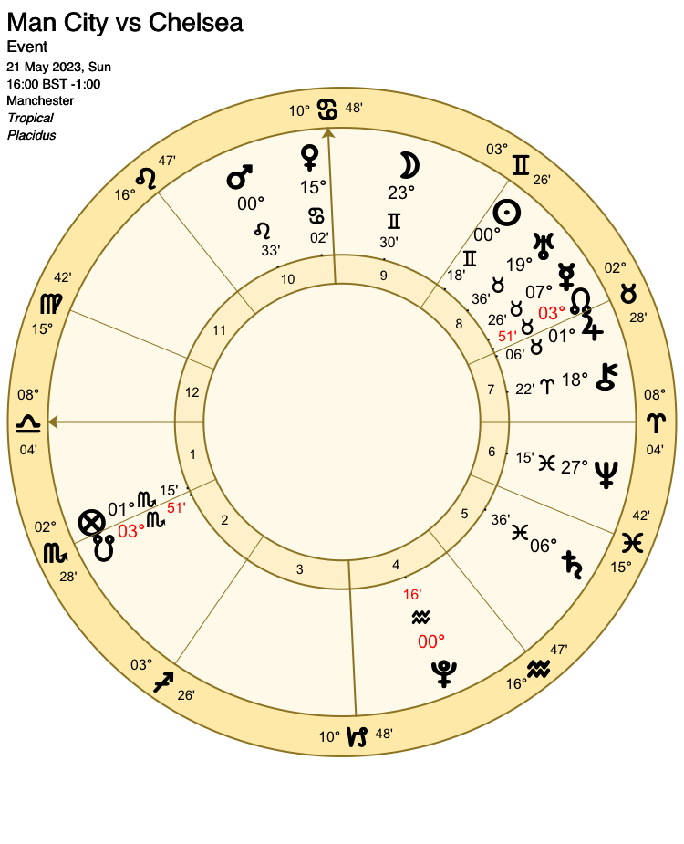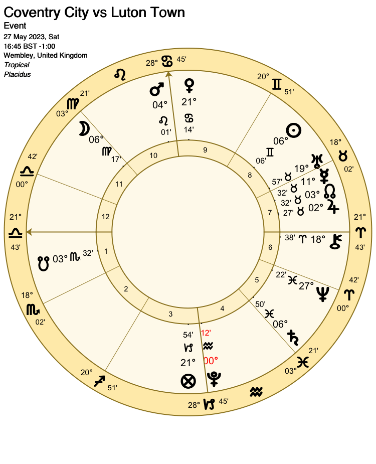Coventry City are represented by Mars, ruler of the opposing 7th house. Saturn, ruler of the 4th house (victory for the underdogs) is Coventry’s co-significator.