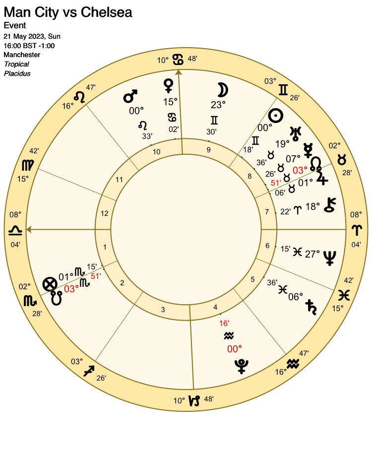 Coventry City are represented by Mars, ruler of the opposing 7th house. Saturn, ruler of the 4th house (victory for the underdogs) is Coventry’s co-significator.