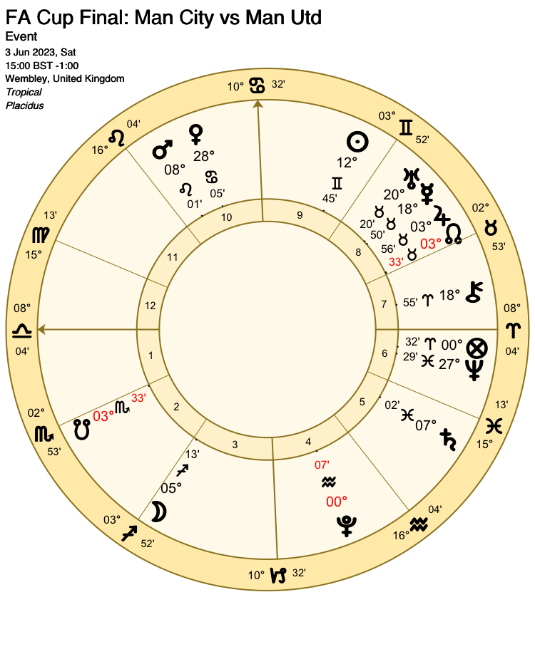 To perfect her conjunction with the Sun, the Moon will need to travel slightly further than the 5 degrees usually considered reliable for a 90-minute football match. The deciding goal for the favourites is likely to occur in extra time.