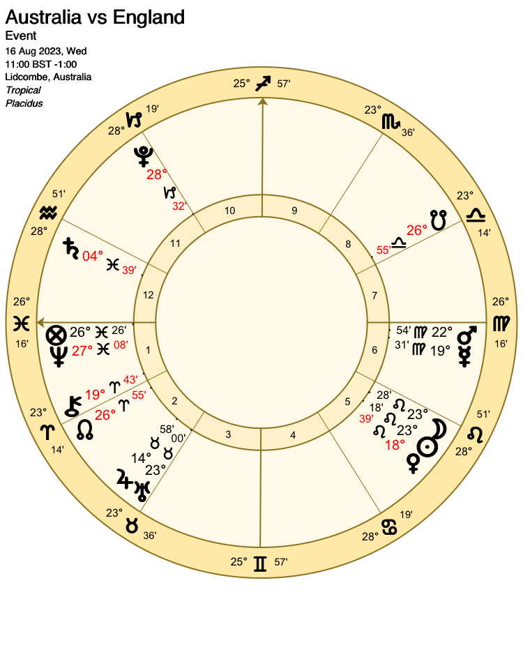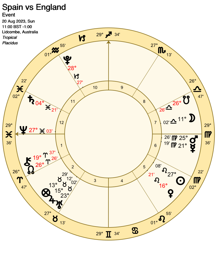 Mercury, ruler of the 1st house represents rivals England. Mercury is in Virgo, the sign of his rulership and exaltation: We can look forward to another formidable performance from the Lionesses.
