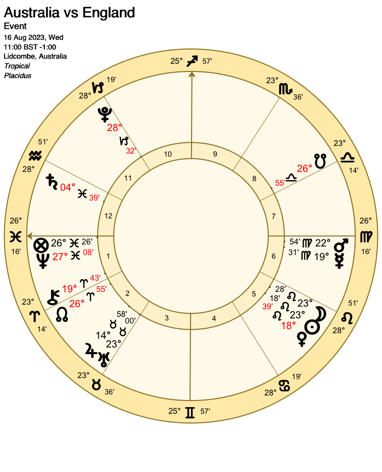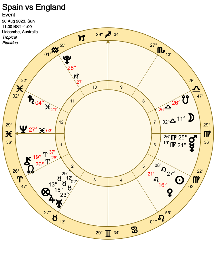 Mercury, ruler of the 1st house represents rivals England. Mercury is in Virgo, the sign of his rulership and exaltation: We can look forward to another formidable performance from the Lionesses.