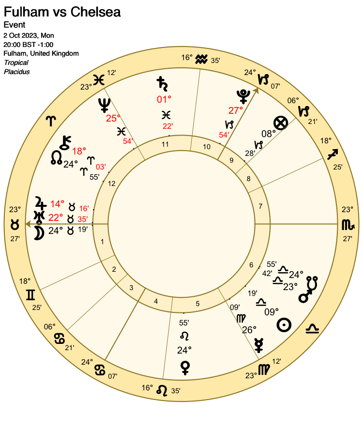Mars, ruler of Scorpio and the opposing 7th house, represents rivals Chelsea. He is their sole significator in this match as the Moon, ruler of the 4th house (victory for the underdogs) has another job describing how events will unfold during the match.