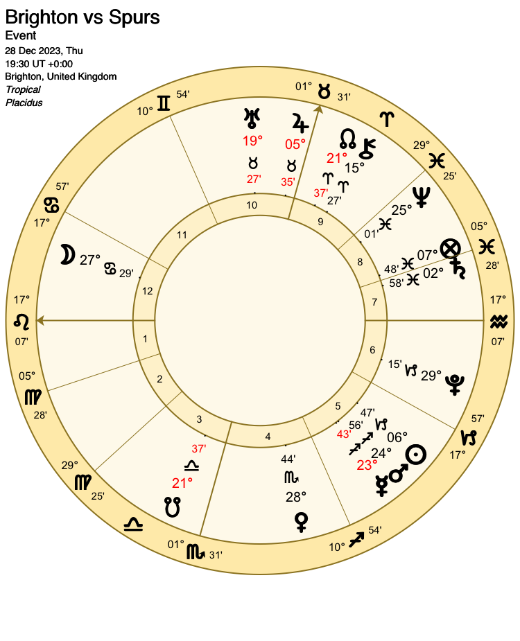 Although Spurs are currently placed higher in the table, the bookmaker’s odds favour home side Brighton: As favourites, Brighton are awarded the Sun (ruler of the 1st house) and Venus (ruler of the 10th house; the house of victory for the favourites).