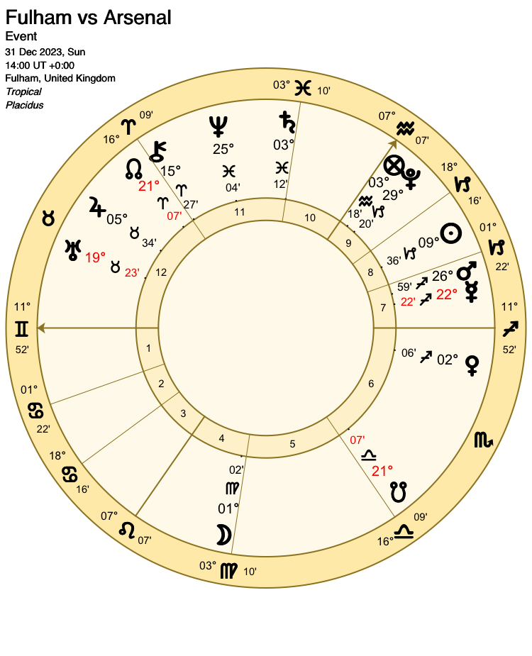 Fulham may have a home advantage, but the pundits still favour Arsenal to win. As favourites, Arsenal are represented by Mercury, ruler of the 1st house and Saturn, traditional ruler of Aquarius, the sign on the cusp of the 10th house (the house of victory for the favourites).