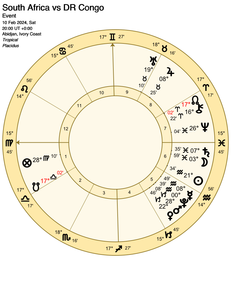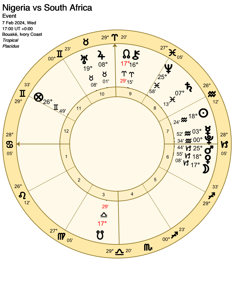 However, the placement of Mars on the cusp of the 7th house depicts South Africa’s efforts dominated by Nigeria’s hopes of victory. This testimony is sufficiently strong to counterbalance the lunar conjunction with Venus.