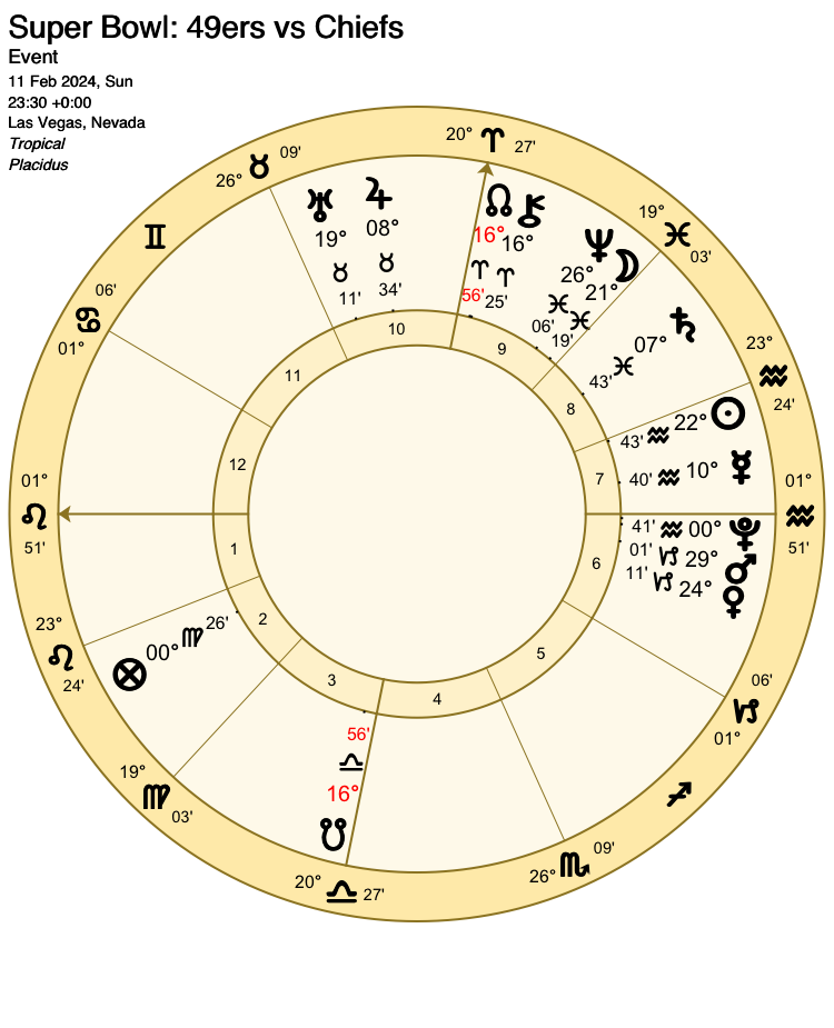 Important Note*: If the kickoff of the game is delayed by longer than 36 minutes (this is not beyond the bounds of possibility), the sign on the cusps of the 10th and 4th houses change from Aries to Taurus (10th house) and Libra to Scorpio (4th house). If this happens, the planetary rulerships will switch from Mars to Venus (for the 49ers) and Venus to Mars (for the Chiefs). *Thanks, Shaun, for drawing my attention to the possibility of lengthy late kickoffs in NFL matches, which can have quite an impact!