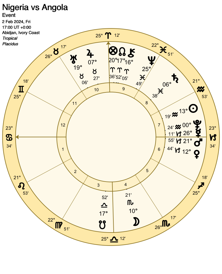 As odds-on favourites, Nigeria would usually represented by the 1st house and its ruler. However, the Moon (1st house ruler) already has a role describing the flow of events, so her dispositor, Mars steps forward from the substitute’s bench as significator for the favourites.