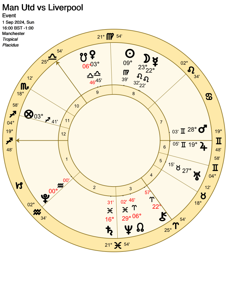 Hosts Manchester United are designated by Mercury, ruler of the opposing 7th house and Mars, ruler of the 4th house.