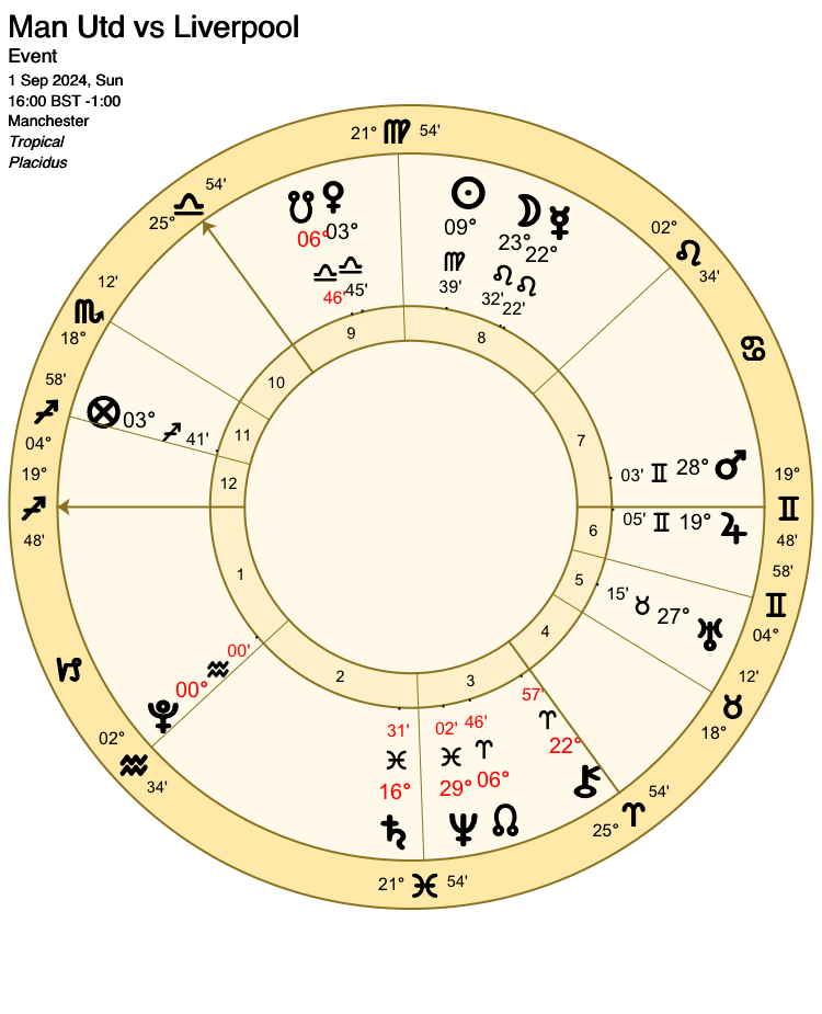 Hosts Manchester United are designated by Mercury, ruler of the opposing 7th house and Mars, ruler of the 4th house.