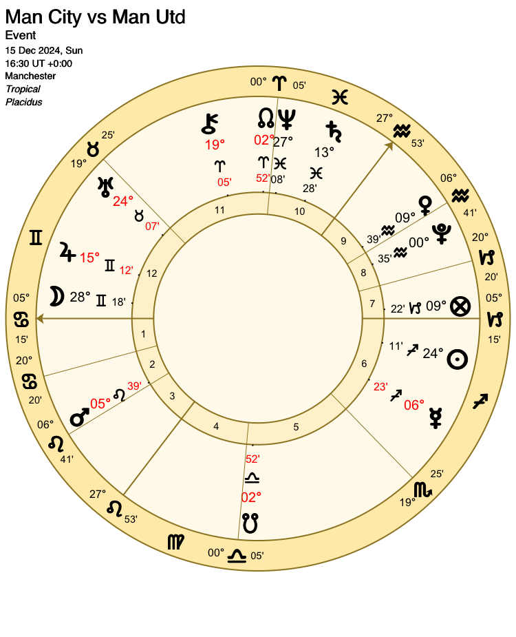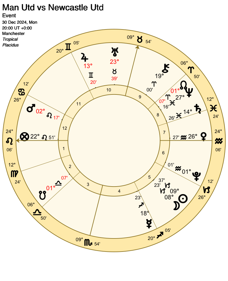 Is there any hope in this chart for Manchester United? Possibly. Venus, ruler of the 10th house (the house of victory for the favourites), is placed in the 7th house, the house of the underdogs: Venus in the 7th house shows that Newcastle’s hopes of victory are the power of Manchester United. If Manchester United play better than expected, they could prove a severe hindrance to Newcastle’s ambitions.